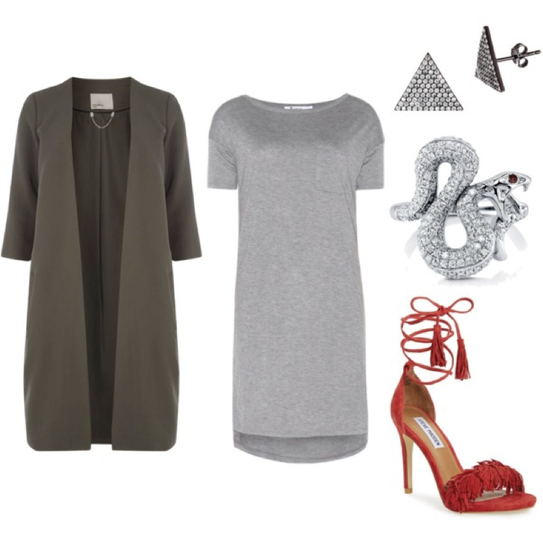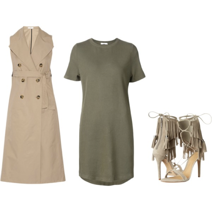 The t shirt under tank trend has been coming out for spring. This sleeveless trench with the army green t shirt dress are such a great combo together, the trench adds class while the fringe shoes give you sass and edge all into one mignifique look.