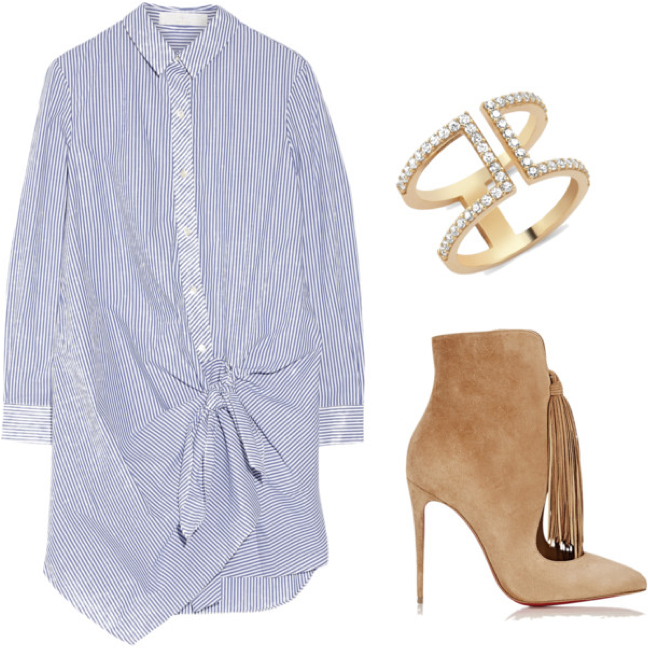 I saw a street style shot of Olivia Palermo in a striped button shirt blouse with a tennis skirt inspired trim along the end (yes the one chosen for my main image). That photo has been in my mind for months now, so when I came across this shirt which is almost identical to the one she wore I HAD to add this into your weekly wardrobe shirt dress looks. Pairing it with a nude suede bootie (Loubs of course) is a must for the full OP inspo look and for your TGIF.